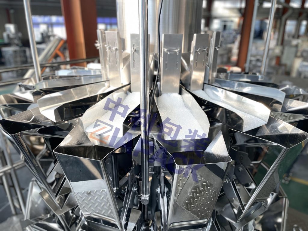 lekvrye Multihead Weigher Machine is geskik vir die weeg van klein korrels soos rys, suiker, fyn tee, skoonmaakmiddelpoeier, ens.